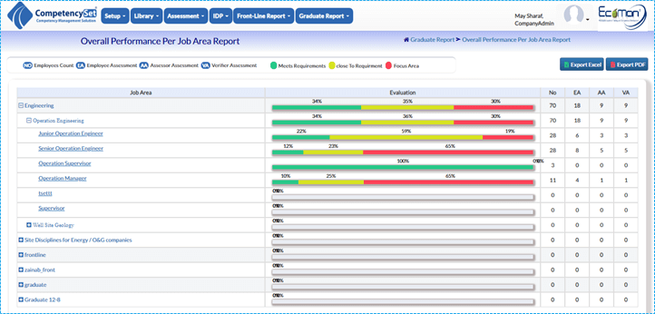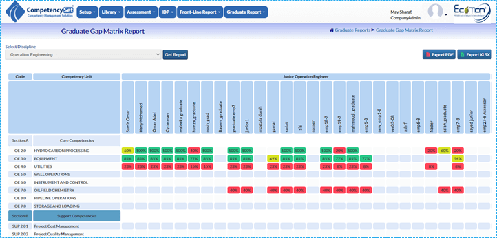 EcoMan University Graduate Development Framework (DFW) defines the competency standards required for the post holder to perform his/her job effectively and safely. Three (3) main Assessment Chapters “Core Competencies, Supporting Competencies, General and Behavioral Competencies” based on four proficiency levels of each competency unit /chapter: